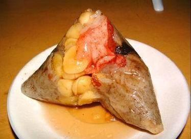 “双烹粽球”除了口感丰盈,其精细程度也丝毫不马虎。咸馅如香菇、虾米等须先连同糯米一起放猪朥、鱼露拌炒,甜馅逐样烹煮备好,将煮过后竹叶卷成漏斗状,放入馅料,包成金字塔型,用水草扎紧,放入大锅中,煮熟即可。其它地方的粽子,做得比较好的有肇庆的裹蒸粽,嘉兴的鲜肉粽,各有千秋。肇庆裹蒸粽用冬叶或水草,嘉兴粽子多用芦苇叶,而潮汕双烹粽球多用竹叶。肇庆也有红豆粽子,但是整颗豆入馅,略显粗糙;双烹粽球里的乌豆沙,其实也是红豆,但须研磨成泥,滤网过滤后留取精华的豆沙,讲究些的还会用猪油网包裹防止掺杂,口感自然爽滑细腻。嘉兴五芳斋的粽子,也有咸的、甜的许多口味,但不会把两种放在一起,其出产的鲜肉粽几乎把肥肉和糯米做到水乳交融的境界,而与之齐名的汕头老妈宫粽球,则选用槽头肉,做法更为讲究,须用南乳腌制加工后才入馅,风味独特。